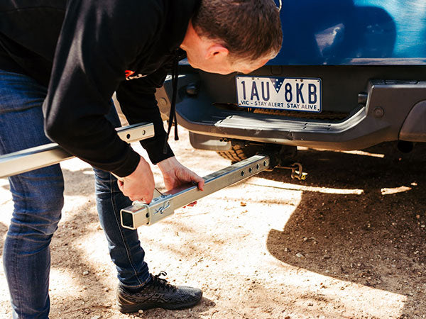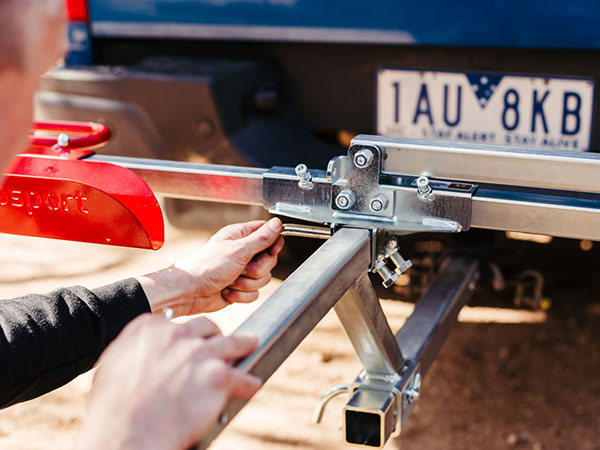 - Fit the Adapter to Your Vehicle – Insert the Tow Bar Adapter into your car’s tow bar hitch and secure it with the Hitch Stabilizer.