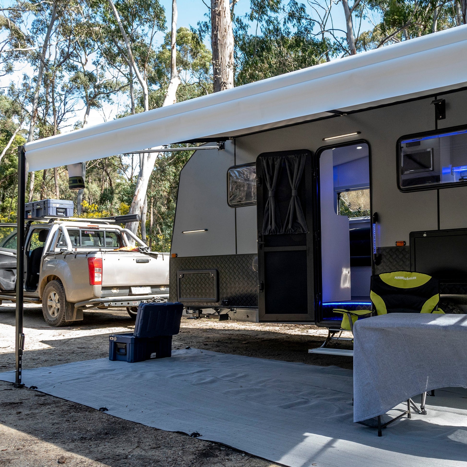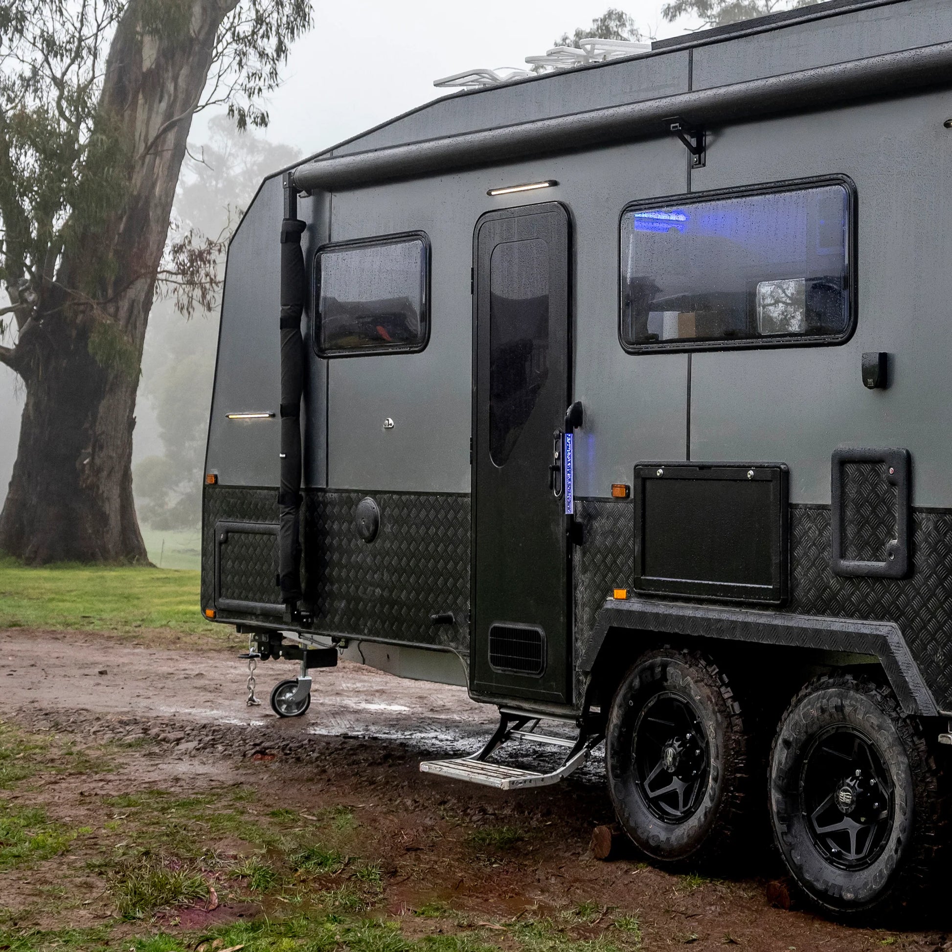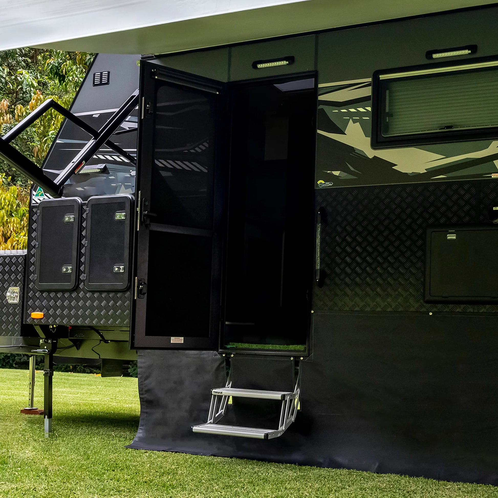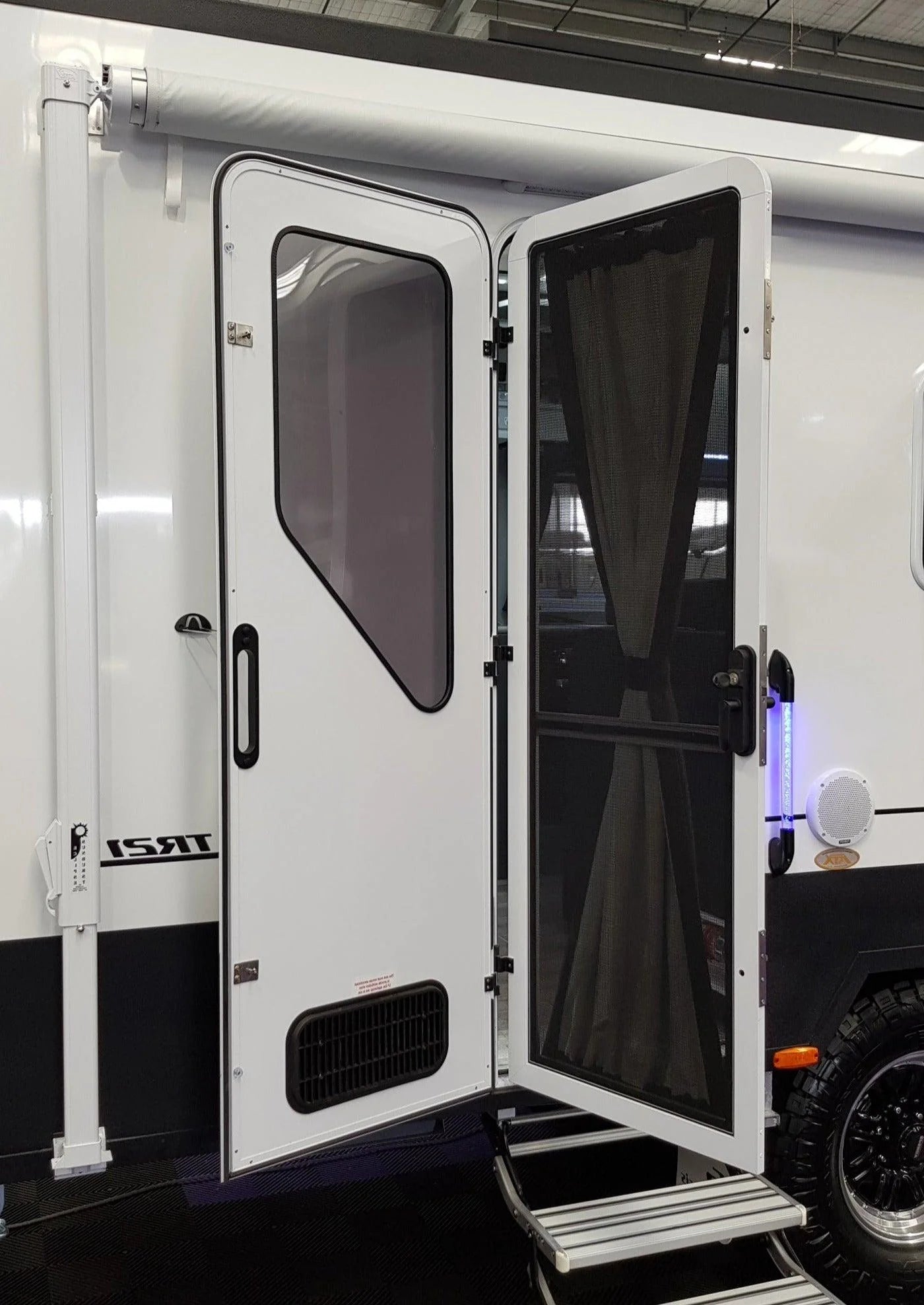 Aussie Traveller DC Doors provide everything from security to sleek design, featuring a unique shaped tinted acrylic window, outer door, security door and our triple compression lock system. Available in a wide range of sizes, frame corner options, left or right-handed hinges and in two popular colours black & white to suit caravans.
